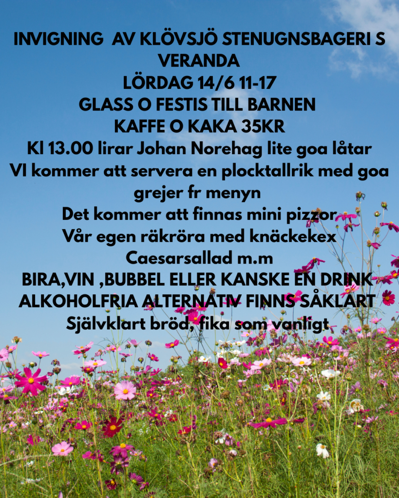 Lördag den 14 juni firas Klövsjö Stenugnsbageris nya veranda in med en mysig invigning för både stora och små. Njut av en plocktallrik med bageriets mat och slå dig ned med något kallt i glaset och ta in stämningen. Bröd och fika finns som vanligt.