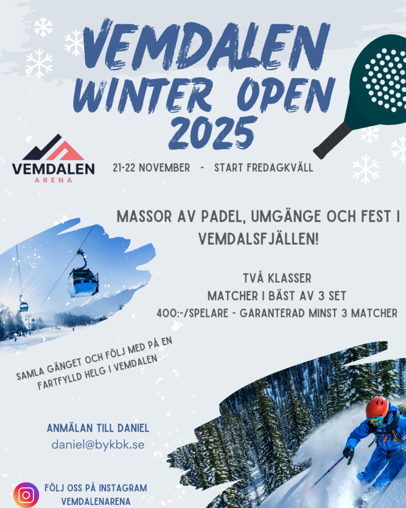 Den 21–22 november arrangeras Vemdalen Winter Open i Vemdalen Arena. Under två fullspäckade dagar samlas spelare från hela landet för att tävla och ha roligt tillsammans.