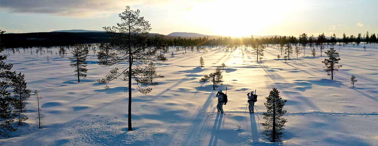 Vintertid erbjuder vi toppfågeljakt med guide. Det är en fantastisk känsla att glida fram sakta på skidor och spana i topparna efter den svarta mäktiga fågeln.