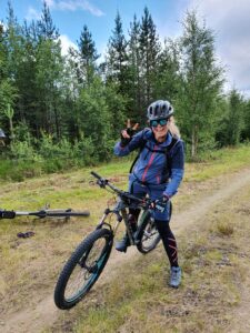 ”Jag skulle säga att en perfekt dag på sadeln innehåller vänner, ett gäng hemmagjorda energibars och en massa skratt. Jag älskar att cykla men är inte den starkaste eller snabbaste i byn, därför är ryggsäcken alltid packad med ombyten, energi av olika slag och lite reservdelar. Vatten kan du fylla på i fjällbäckarna längs vägen. 4,5-milsslingan är inte den lättaste så var beredd på en heldag om du inte är van cyklist”