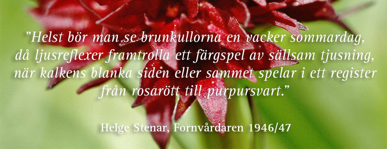 Brunkullan är visserligen en lågväxt liten rackare, men den röjer sig lätt på fjällängarnas karga blomstermatta genom dess kraftiga, till en början nästan svartaktiga purpurfärg och med en stark igenkännande vaniljdoft.